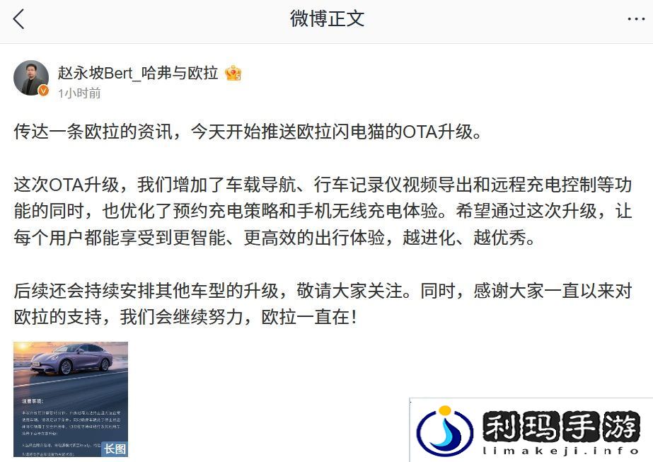 本站 3 月 3 日消息,据长城汽车哈弗、欧拉品牌总经理赵永坡分享,欧拉闪电猫今日起将获第四次 OTA 升级,包含 6 项新增功能和 2 项体验优化。