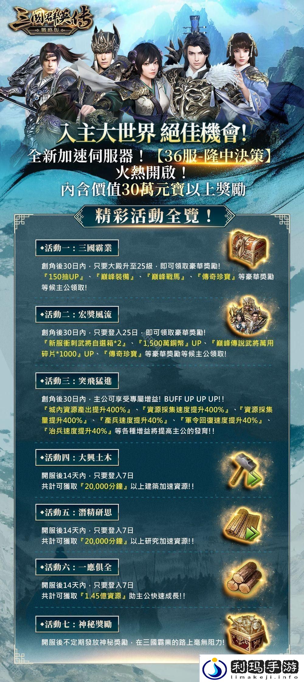 全新加速服务器「36 服 - 隆中决策」现已正式火热开启!本服重磅推出豪华限时奖励,包括武将 150 抽、巅峰装备、战马、传奇珍宝等稀有宝物。此外,深受玩家喜爱的的「武将自选箱」及「巅峰传说武将万用碎片」也通通免费赠送!