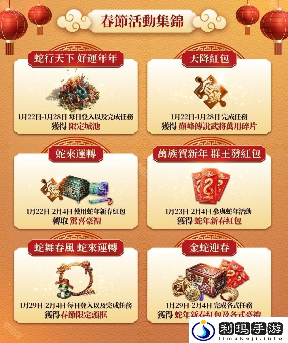 金蛇迎春,祥瑞满门!活动期间完成指定任务,即可领取「精緻军粮」、「转职虎符」、「将星列传石」、「巅峰传说武将万用碎片」等丰厚奖励!此外,透过蒐集「蛇年新春红包」,可以免费参加春节特别转盘活动,赢取蛇年限定神秘外观及头框,满载惊喜!