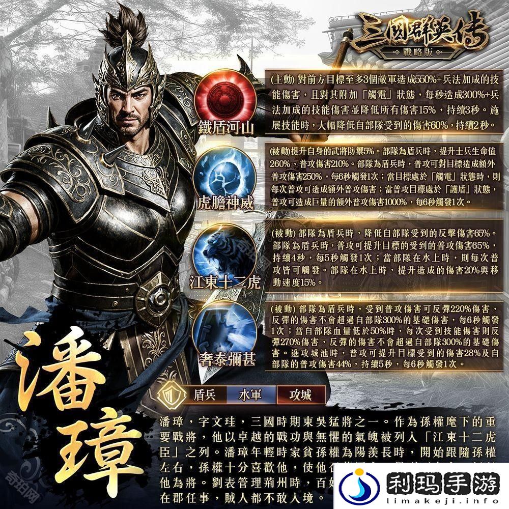 与程普、黄盖、韩当等人并列「江东十二虎臣」的传奇人物 –「潘璋」即将震撼登场!潘璋为虎胆神威的象征,作为孙权麾下的一员猛将,他屡立战功,尤其在水战中展现出绝对的实力,令人叹服。在《三国群英传 - 战略版》中,潘璋作为普攻的强者,具备快速破盾、反弹伤害及水上优势,他的现身将为**增添锐不可挡的攻势!