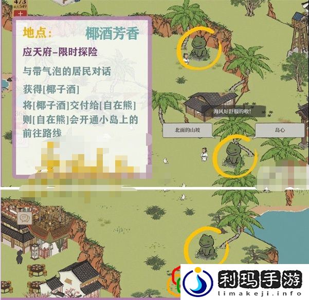 与带气泡的居民对话,获得[椰子酒],将[椰子酒交付给[自在熊],则[自在熊]会开通小岛上的前往路线。
