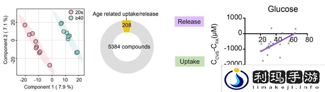 研究者进一步探讨了年龄对人脑代谢的影响,分析了年龄与脑部代谢物摄取和释放的相关性,鉴定出 8 种代谢物和 15 种脂质的血脑交换特性与年龄相关。随着年龄增长,大脑对葡萄糖的摄取减少,反映出大脑代谢活性的降低。大脑对 TAG 48:3 (18:1) 的消耗随年龄增长而增加,大脑释放的天冬酰胺(asparagine)、胆绿素(biliverdin)和溶血磷脂酰胆碱(LPC)随年龄增长而增加。