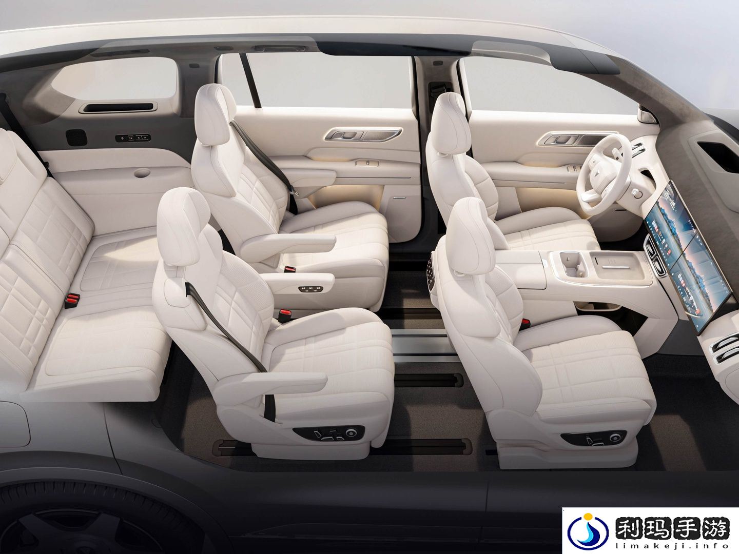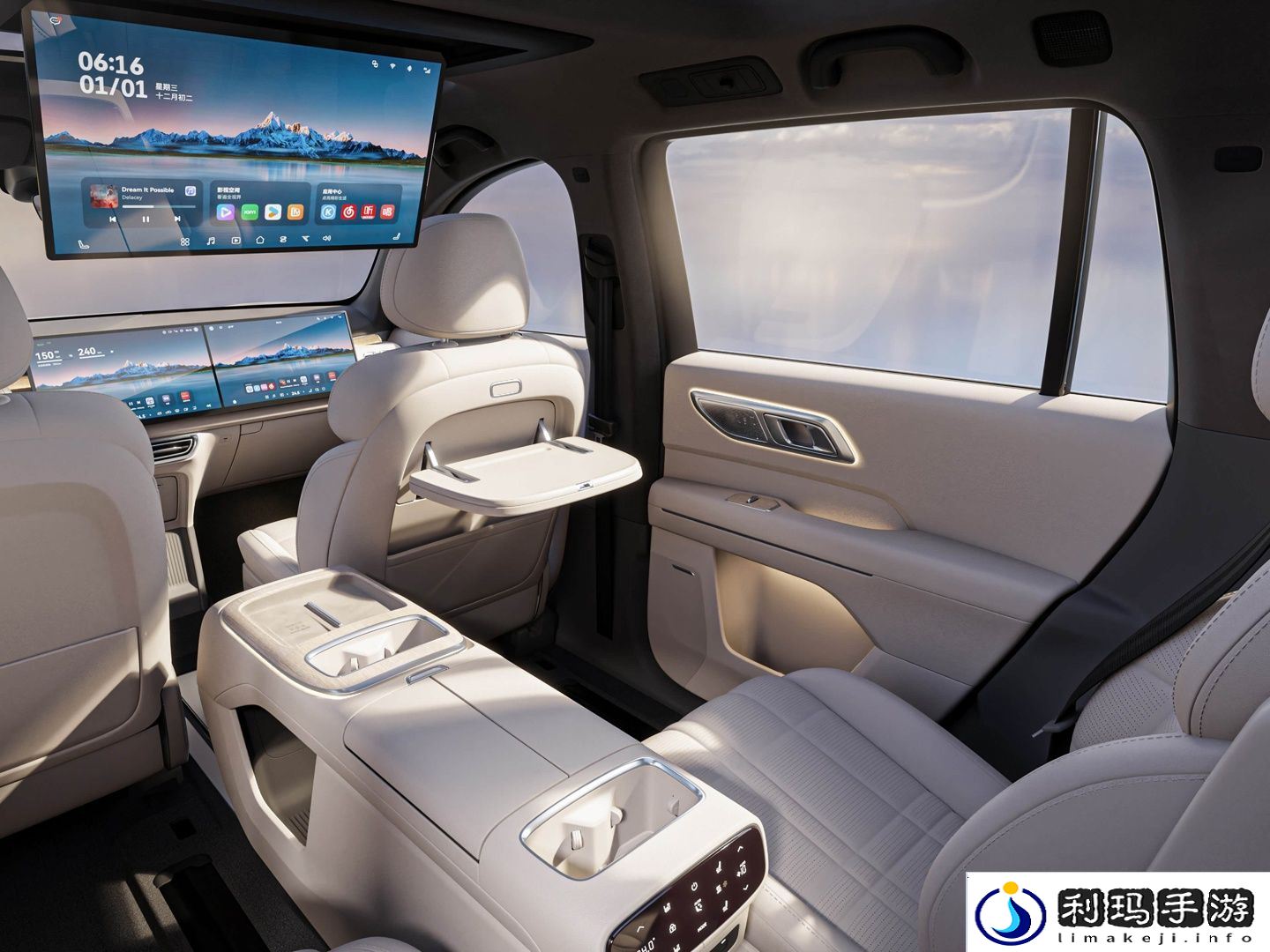 中排配备“行业唯一可横滑”双零重力按摩座椅 + 21.4 英寸高清娱乐屏。中排座椅支持 180mm 双横滑、一体式云感腿托、8 点式凸点按摩、通风、加热。此外,该车还配备 21.4 英寸、3K、16:9 比例、0-75° 电动可调后排娱乐屏。该车配备一体式智能移动中岛,翻盖式冰箱-6 至 50℃随心调。